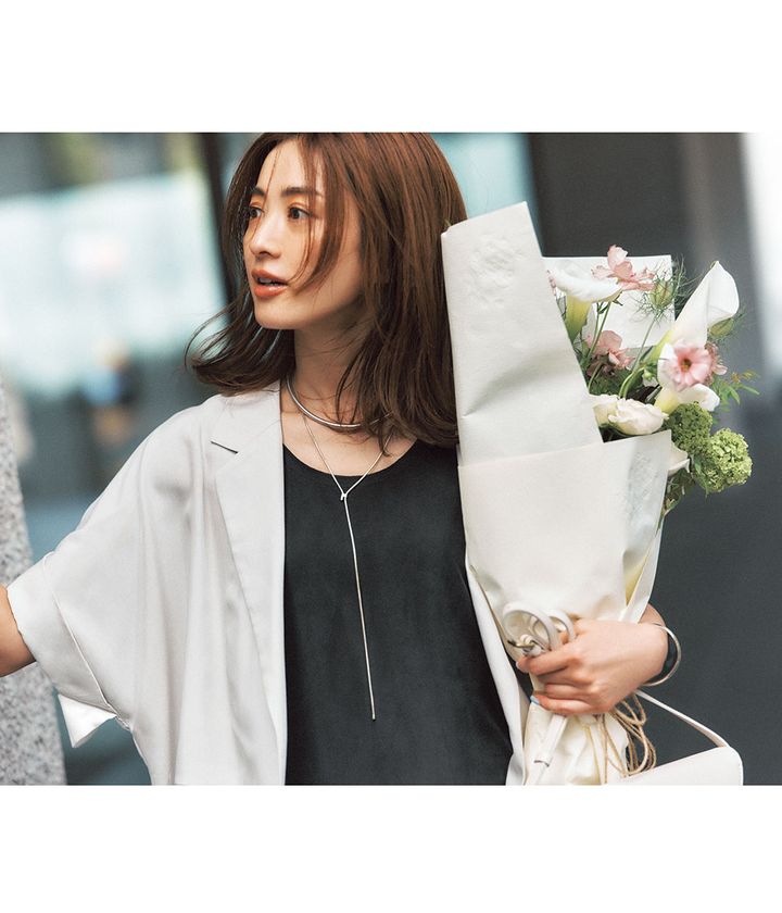 イージーケアがうれしいシルク素材のナローワンピに旬の半袖ジャケットを重ねて大人のお出かけスタイルに。ラリエット風に垂らしたシルバージュエリーでモダンな空気感を纏って。