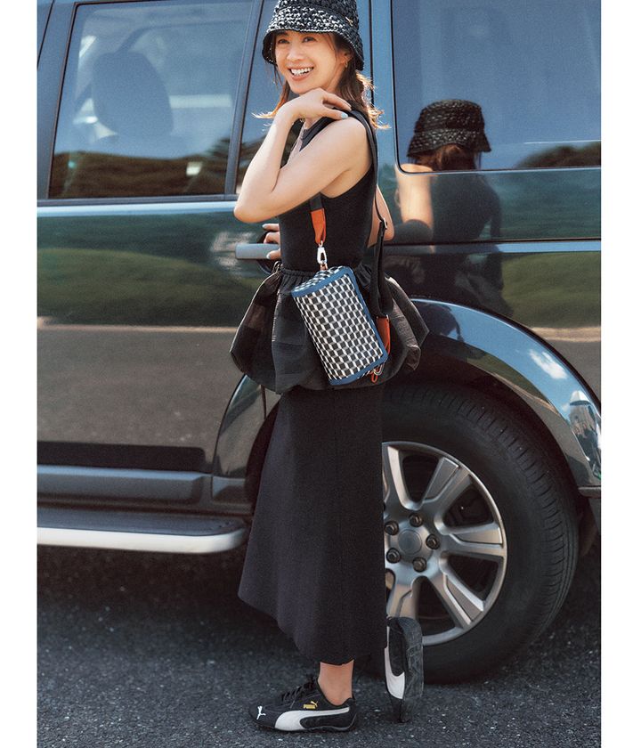 ワンピース¥10,450(ミラ オーウェン/ミラ オーウェン ルミネ新宿2店)ハット¥28,600(カタルツィ 1910/ロンハーマン)バッグ¥83,600(ピエール アルディ/ピエール アルディ 東京)ミニスカート¥33,000(ヴェニット/ハルミ ショールーム)スニーカー¥14,300(プーマ/プーマ お客様サービス)ピアス¥26,400(プラウ)