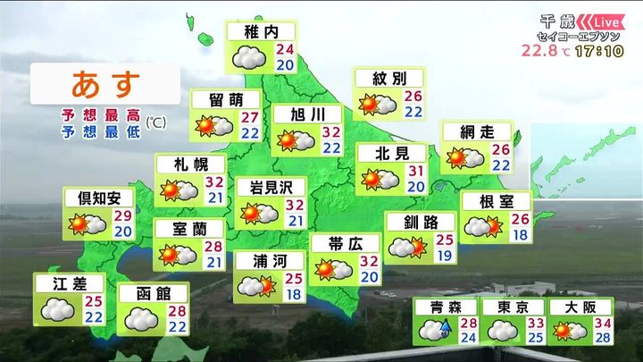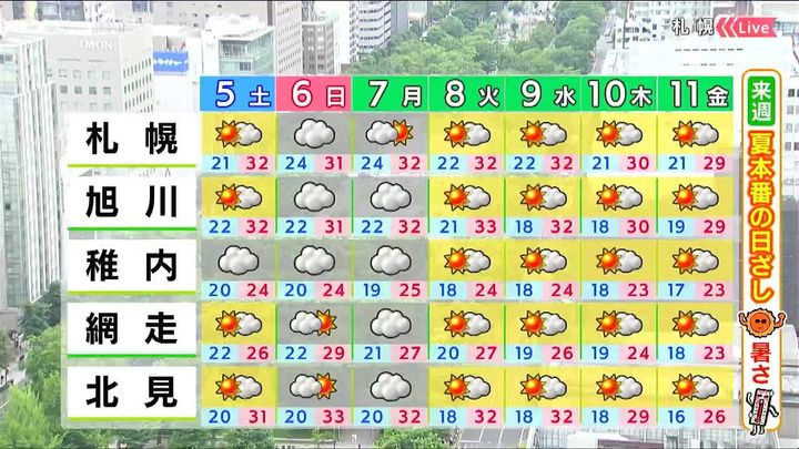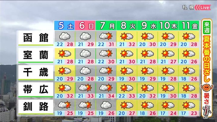 日曜は曇りますが、気温は高く蒸し暑いでしょう。来週は真夏の日差しと暑さが続きます。海岸部の室蘭でも月曜、火曜は30度の真夏日予想です。