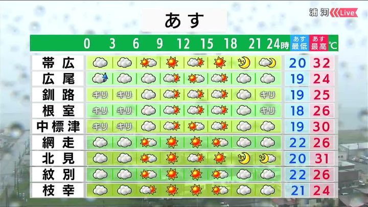 天気は回復し、広く晴れるでしょう。最低気温は20度前後で、今夜も寝苦しいでしょう。日中は内陸で真夏日となり、札幌、旭川、岩見沢、帯広は32度です。