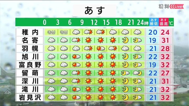 朝から広く晴れるでしょう。日中は富良野や滝川でも32度など、内陸を中心に厳しい暑さです。熱中症や食品の取り扱いにも注意して下さい。