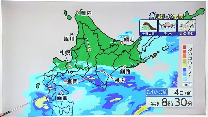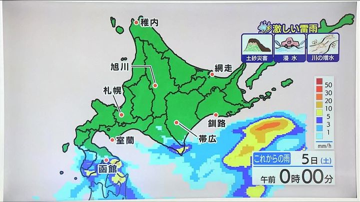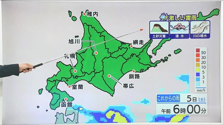 今後は内陸ではあと数時間、太平洋側はあす5日(土)明け方にかけて雨の強まるおそれがあります。道南方面では大雨による土砂災害や低い土地の浸水、河川の増水に注意して下さい。