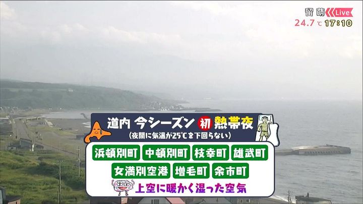 道内はきのう3日(木)の夜からきょう4日(金)の朝にかけて、今シーズン初めて気温が25度を下回らない熱帯夜になりました。道北の浜頓別町や枝幸町、増毛町など7地点で熱帯夜となりました。上空に暖かく湿った空気が流れ込んだ影響です。