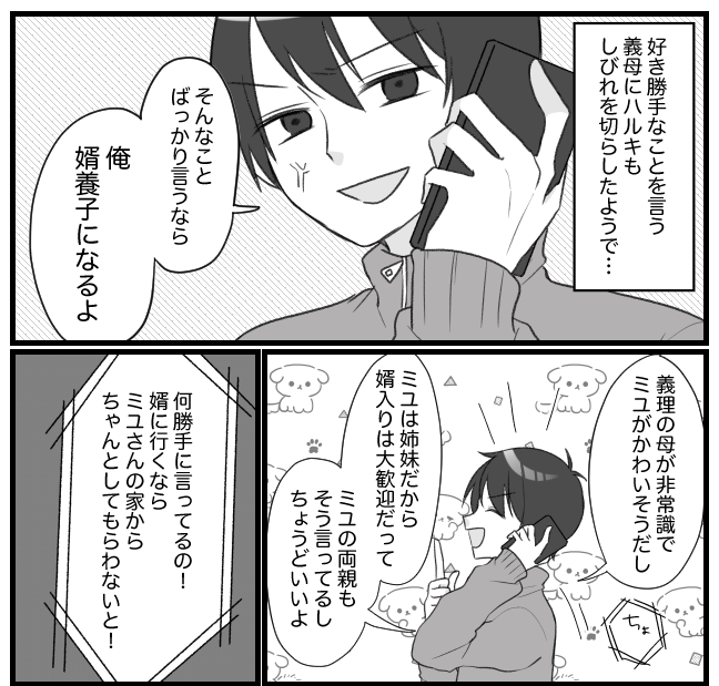 義母は電話で「こっちに戻ってらっしゃい!ケーキもあるのよ!?」とハルキに連絡。しかし、ハルキは「誕生日はミユに祝ってもらうからいい」「同居でミユには苦労かけたし、ゆっくりさせてあげたい」と返します。