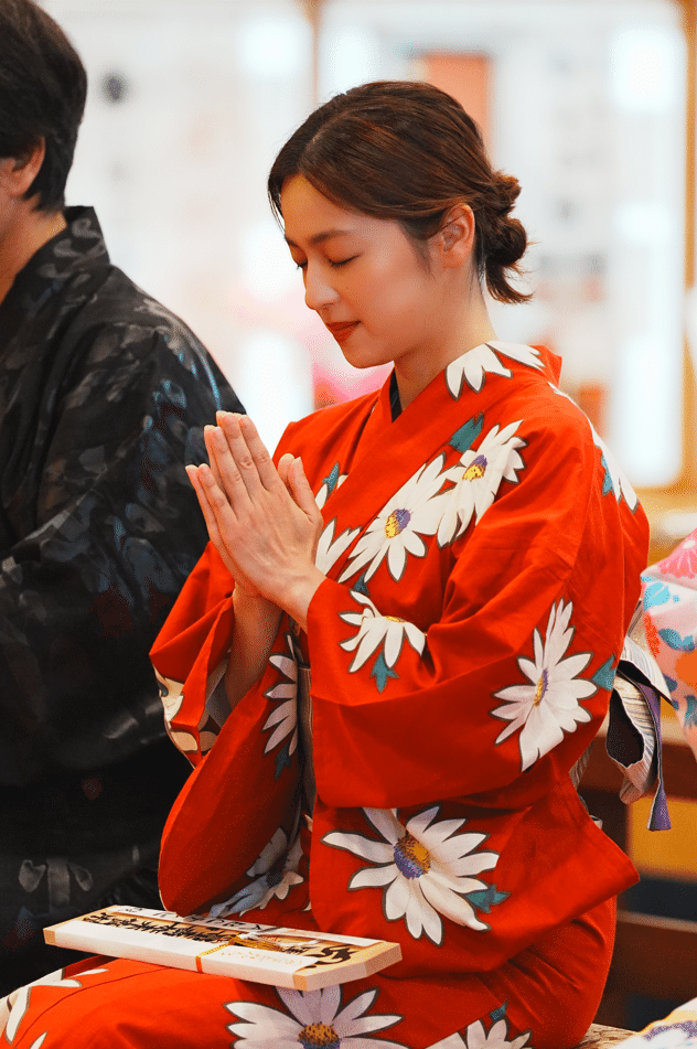 増上寺・安国殿で、参列したキャストに向けてドラマヒット祈願を祈祷いただいた後、キャストを代表して朝山朝子役の中村がお札を受け取り、「ご祈願いただいたので、これでドラマも大ヒット間違いなしですね!」とコメント。