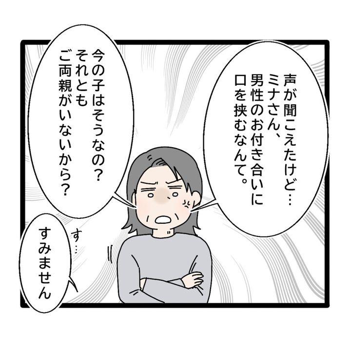 「声が聞こえたけど・・ミナさん、男性のお付き合いに口を挟むなんて。今の子はそうなの?それともご両親がいないから?」映画の約束の私たちの会話を聞いていた義母が文句を言ってきたので「す・・すみません」と思わず謝りましたが、両親がいないことを嫌味のように言われて傷つきました。