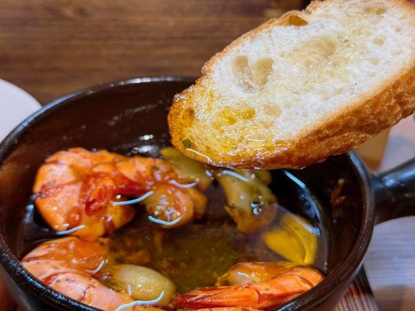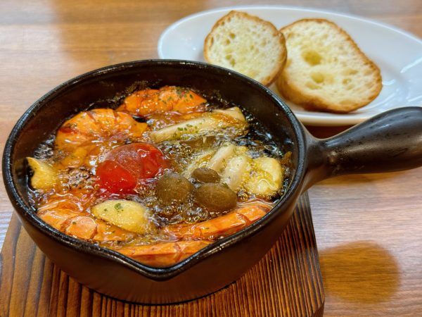 中にはエビがたっぷり入っており、オイルを染み込ませたバケットと共に頬張ると…もう止まらない美味しさです! バケットはプラス100円で追加できます。「おかわりしたい」と思わせてくれる、バル定番ながらも確かな技が光るメニューでした。