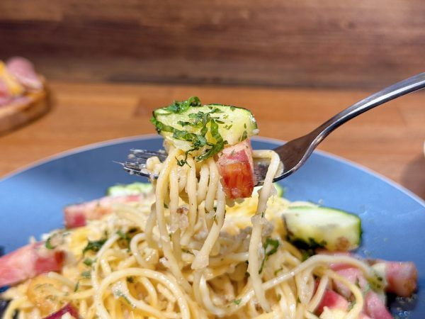 まずは「季節のパスタ」(1,400円・税込)をいただきました。この日のパスタは、旬の素材ズッキーニをふんだんに使ったオイルパスタ。ズッキーニの甘みとオリーブオイルの香りが絶妙に調和し、口に運ぶたびに素材の良さがじんわりと広がります。