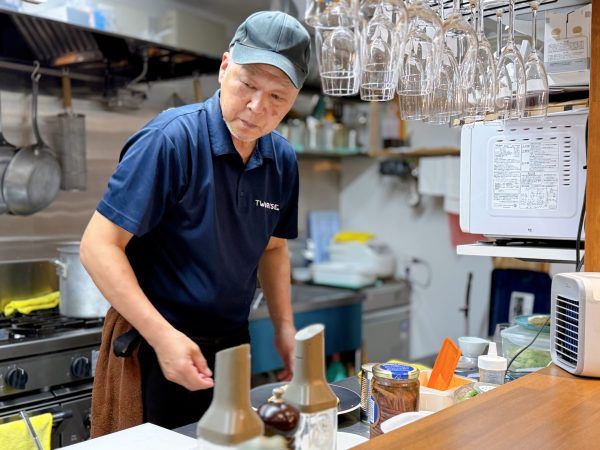 キッチンでは、料理をテキパキとこなすオーナーシェフの姿が。手際よく調理を進めながらも、店全体を静かに見守るような存在感。ひと皿ひと皿に込められた丁寧な手仕事から、料理への情熱が伝わってきます。