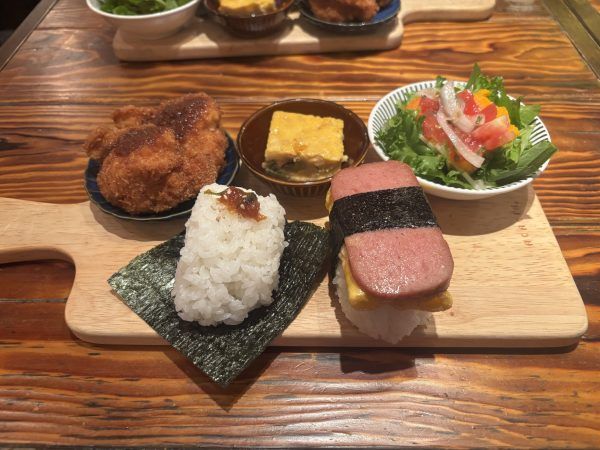 おにぎりが値段によって様々な具があり、1・2・3番の3種類に分かれています。 それにおかずが日替わりで付いてきます。この日のおかずは、チキンカツ、じゃがいものオムレツ、ほうれん草のかき玉お味噌汁で+250円でシフォンケーキとスモアを付けられます。