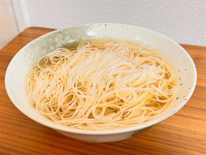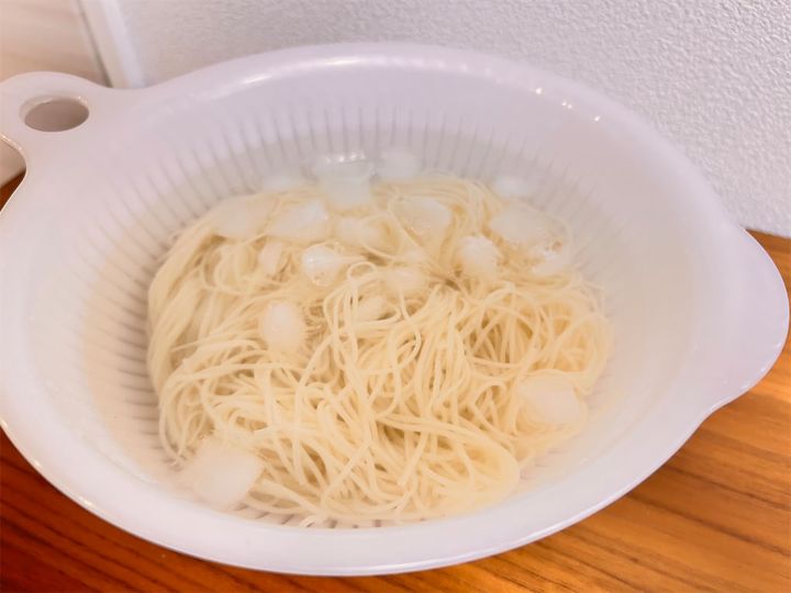 そうめんがキンキンに冷えたら、水気をよく切って…。