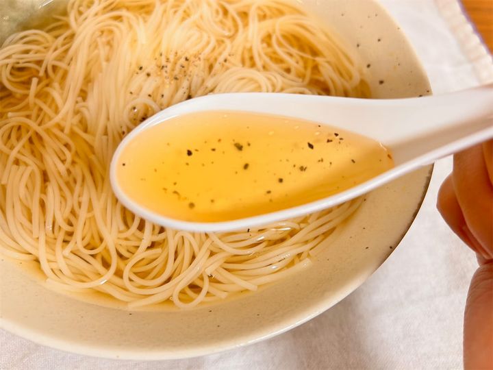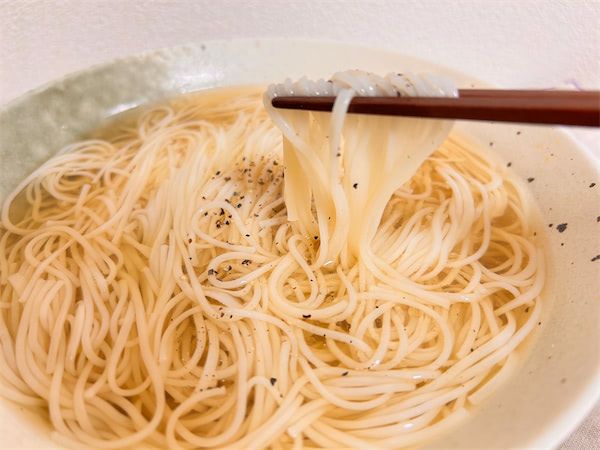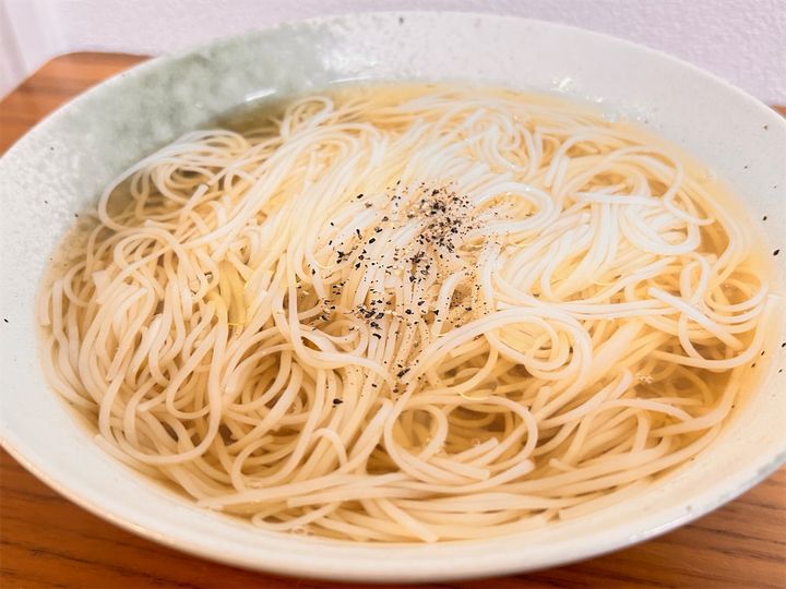 オリーブオイルのコクと黒こしょうのピリッとした刺激がアクセントになっていて、シンプルなつゆをグッと引き立ててくれます。