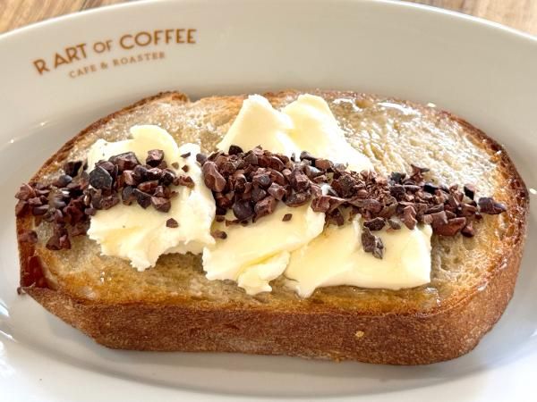 ホイップしたクリームチーズの塩気と、はちみつの自然な甘さ、カカオニブのカリカリした食感と香ばしいカカオの味わいが、トーストと絶妙に合う!お代わりしたくなる美味しさでした。