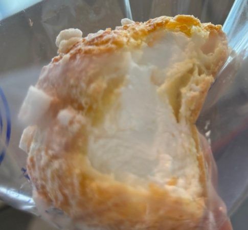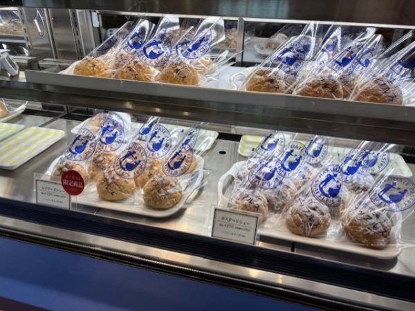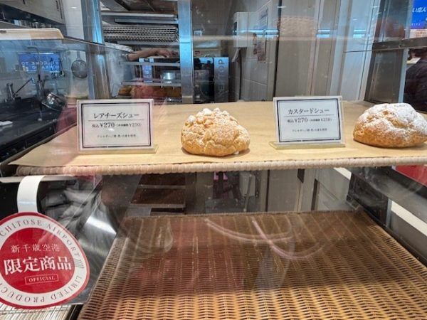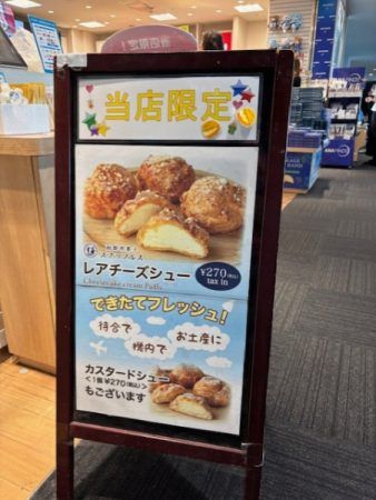 ありました!!会計カウンター下に!早朝や夕方以降のフライトが多かったため出会えずにいたのですが、この日はお昼前の便でやっと買えました♪店内で焼きあげるシュークリームはレアチーズシューとカスタードシューの2種類。カスタードシューは、他の店舗でも取り扱いがありますので、やはりおすすめはレアチーズシュー!です。