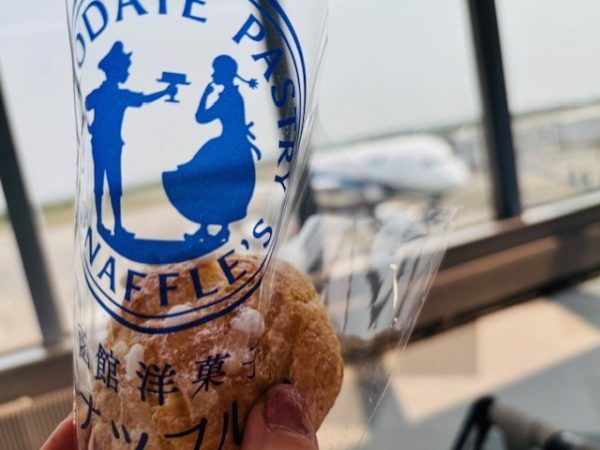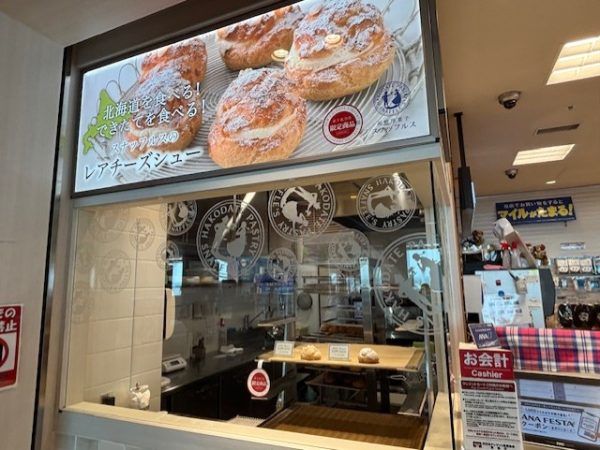 函館洋菓子「スナッフルス」のレアチーズシューは、新千歳空港の保安エリア内、ANA千歳7番ゲート店で焼き上げています。