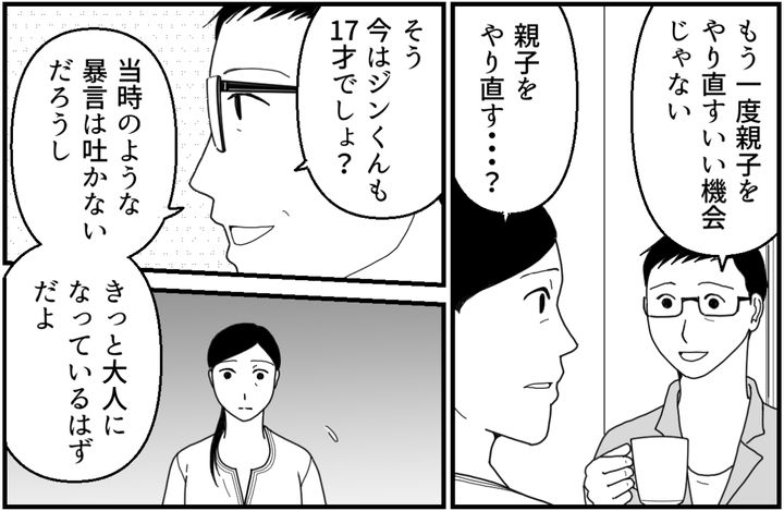 私(マリ)は大学生の娘ユメと2人で暮らしています。9年ほど前、離婚した元夫シンイチが8才だった息子のジンを引き取りました。それ以降は本人に面会拒否され、ずっと会うことはなかったのですが……。ある日突然、元夫が交通事故に遭ったという連絡が入りました。元義母からは「しばらくジンを引き取って面倒みてほしい」と言われます。ジンは現在高校2年生になっているはず。しかし私にはジンに傷つけられた辛い記憶が蘇ってきてしまうのでした。