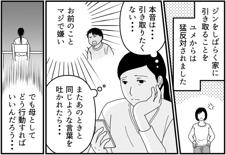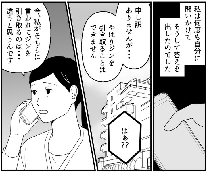 今、元義母に言われたとおりにジンを引き取ったとしても、きっと彼は何も変わらないでしょう。私はジンの母親ではありますが、ジンのために自分の身を削る気持ちはもう持ちあわせていませんでした。私が出した結論を、元義母にしっかり伝えたいと思っています。