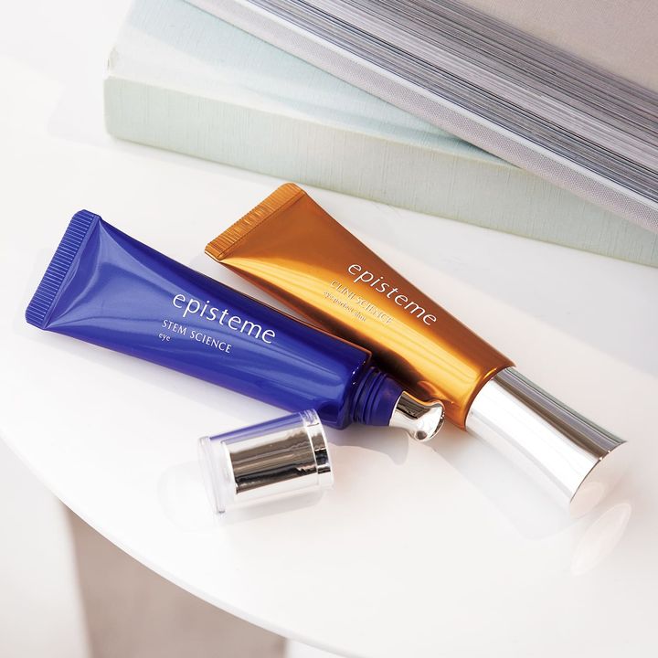 「目元ケアは毎日コツコツ積み上げられるかが将来を決めるので、続けられるかが大切なポイントに。朝に使う、クリニサイエンスアイパーフェクトショットは、テクスチャーの良さに感動して倒れそうに。両立するのが難しいと言われていた保湿感・さらりとした使用感・ハリ感の3つを見事に融合しています。夜に使うステムサイエンスアイはアプリケーター付きで楽しくケアできます。筋肉幹細胞に着目していて、眼瞼下垂気味のまぶたにハリが出てぱっちりとした目に」(咲丘さん)上から、18g¥12,100、18g¥19,800(ともにロート製薬)