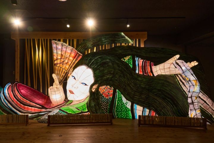 また、館内には「五所川原立佞武多(ごしょがわらたちねぷた)」で実際に使われていた「竹取物語」を題材にしたねぷたの上部の展示も。2019年制作のもので、その鮮やかな色と迫力に、思わず足を止めて見惚れちゃいます!