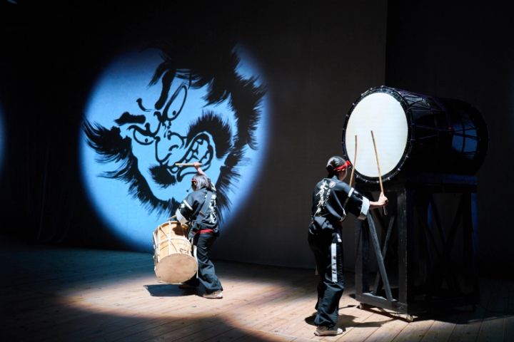 一面のスクリーンを使用し、映像と照明を駆使した仕掛けも。弘前ねぷたまつりを表現したステージでは、太鼓のリズムに合わせ、ねぷたの絵がスクリーンに映し出されます。