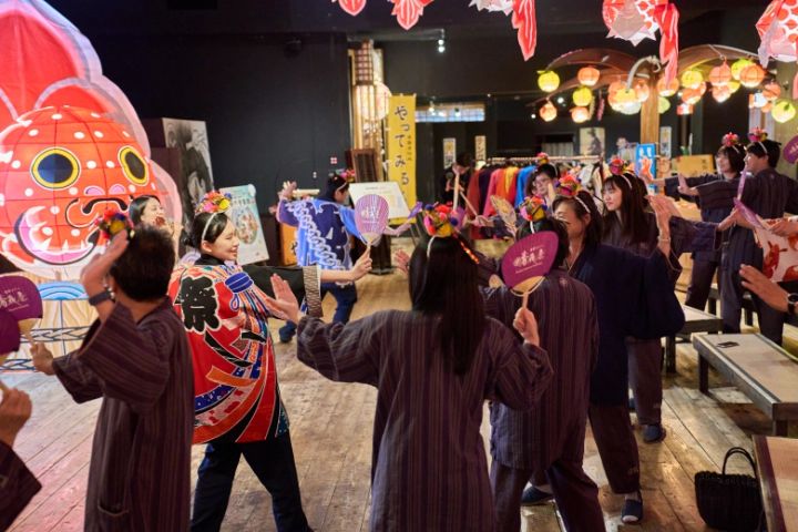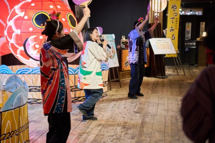 さて、ショー以外にもお祭り気分を楽しめるイベントがまだまだ盛りだくさん。2025年8月31日まで、青森の伝統舞踊「津軽手踊り」を誰でも楽しめる「わもなもねぶた音頭」が開催されています。「わもなも」とは、青森の方言で「わたしもあなたも」という意味。その名の通り、初めましてのお客さん同士で一緒に盛り上がっちゃいました!