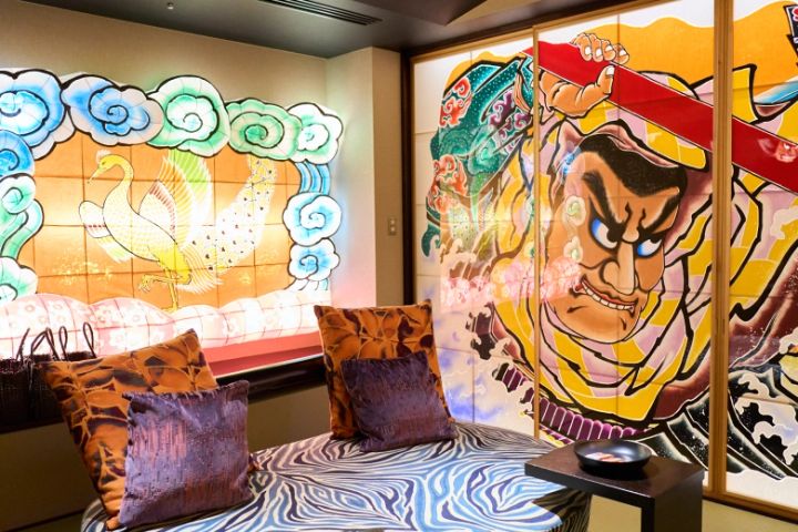 ベッドルームのふすまや天井にもねぶたが。この部屋に泊まれば寝ても覚めてもねぶたに囲まれることに。お子さんもテンションが上がるはず!?