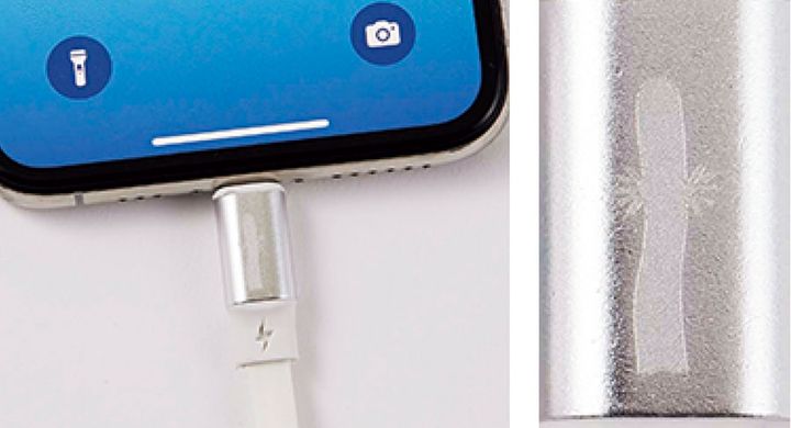 スマートフォン用(iPhone対応)の出力用の端子は、スマートフォンの画面を上にした状態でニョロニョロのマークを上にして差し込んでください。