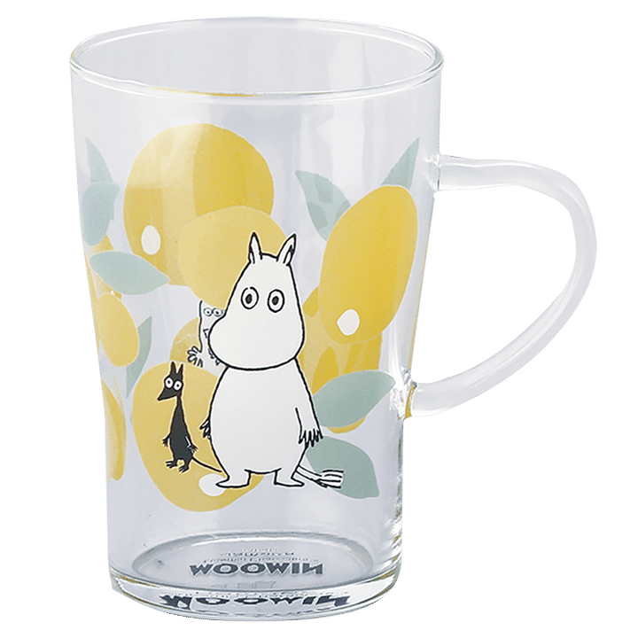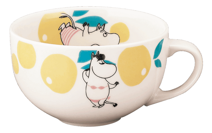トロピカルカラーのフルーツ柄スープマグと耐熱ガラスを使用したグラスは、ダイニングテーブルを華やかに。愛らしいムーミンの表情もポイント。