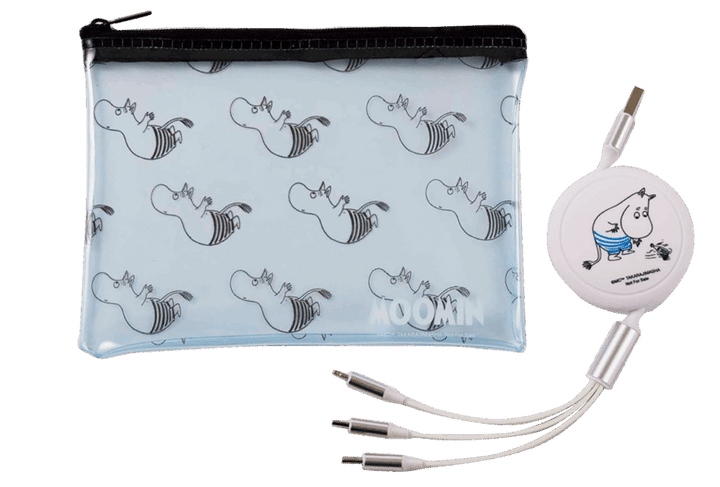オトナミューズ2025年8月号増刊の付録は、水着姿のムーミンがキュートなUSB充電ケーブルとビニールポーチの2点セット。ケーブルは3種の端子付きでさまざまな機器に対応。ビニールポーチはスマートフォンとUEB充電ケーブルを収納可能。
