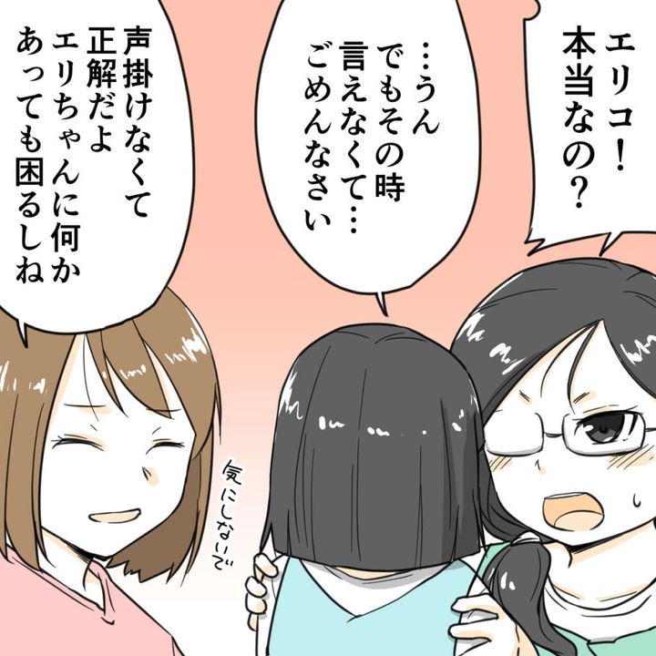 「エリコ!本当なの?」驚いて母親のミチコも詰め寄ると、「・・うん。でもその時言えなくて・・ごめんなさい」と謝るエリちゃんに、「声掛けなくて正解だよ。エリちゃんに何かあっても困るしね。気にしないで」と言いました。