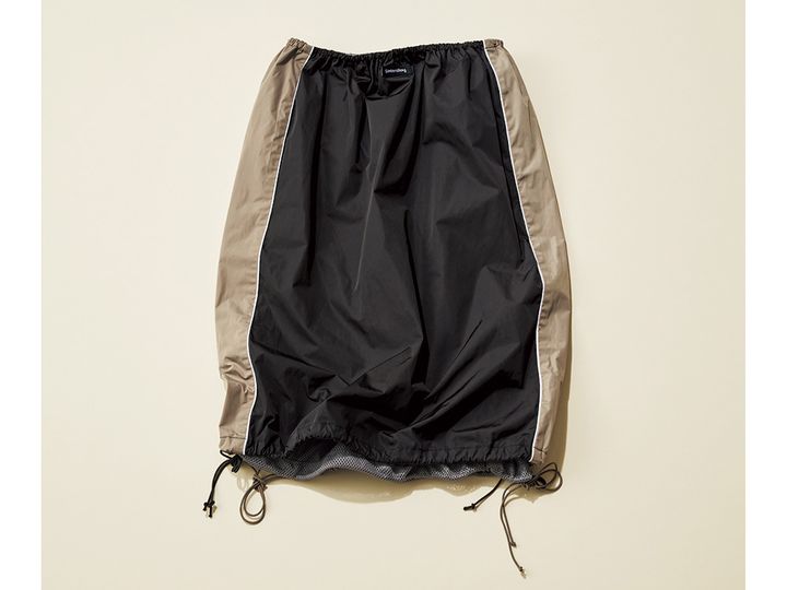 ナイロンの膝丈スカートのインにメッシュをあしらったスポーティな1枚。紐の調整で表情を変えて着られます。スカート¥47,300(シー/エスストア)