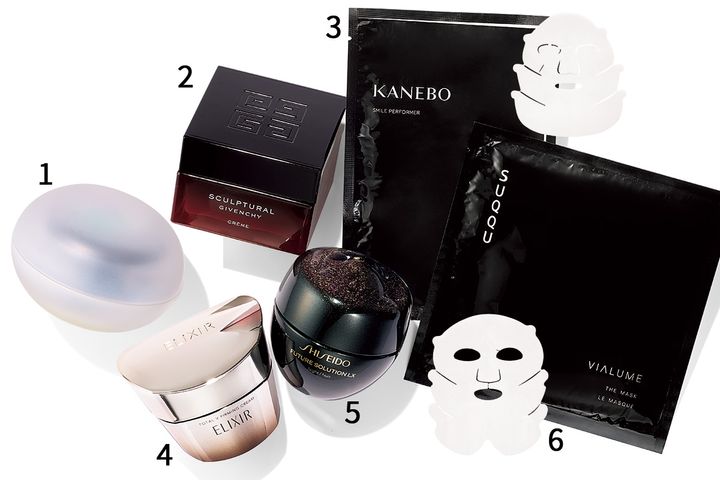 加齢とともにぽっちゃりボリューミーな頰や顎周りが下垂。輪郭が四角くなったり、顎のポニョや顔周りがもたつくブルドッグ顔は、まずは肌を引き締めてハリを出す成分配合のコスメを。さらにフェイスラインを引き上げて装着するシートマスクでのスペシャルケアで、相乗効果アップ。