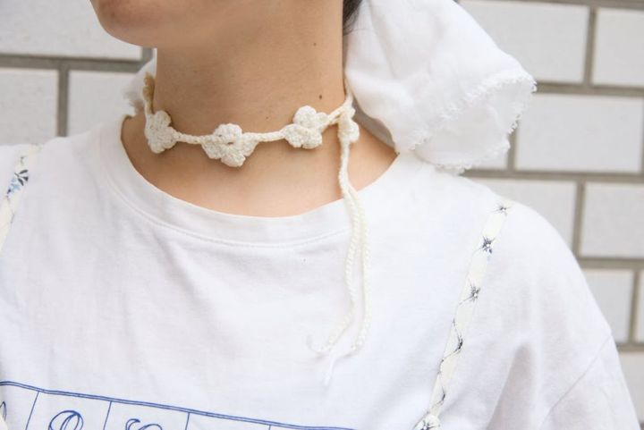 手編みで仕上げたチョーカーは、首もとにさりげない個性をプラス。