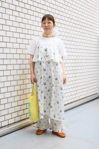 「ワンピースはアンティークのような花柄に一目惚れ。同じシリーズのパンツは、裾のフリルがポイント。セットアップで着こなしたくて購入しましたが、どんなアイテムとも合わせやすく、スタイリングのポイントになるのでお気に入りです。