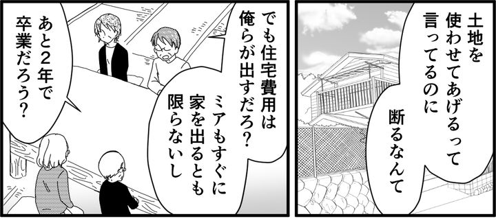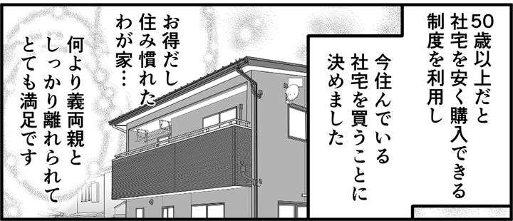 私(ヒロミ、50代)は夫(マサヨシ、50代)と娘(ミア、大学2年生)との3人暮らし。長年夫の会社の社宅(一軒家)に住んでおり、長男は就職して家を出ています。うちの近所に義実家がありますが、夫も私も正社員として働いているため、仕事を理由に義実家へは行きません。義両親(80代)との折り合いも悪いです。しかし最近、義両親が義実家を二世帯住宅に建て直し、私たち夫婦と同居して介護させようとしていることがわかりました。勝手な主張を続ける義両親や、深く考えない夫にイラ立ち、私は離婚も視野に入れていると伝えます。夫には断るように念を押しましたが……義両親は納得がいかないようで、話し合うことになりました。