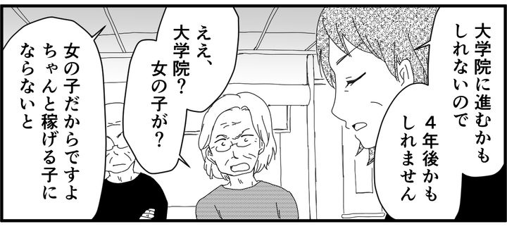 「ミアは大学院に進むかもしれないので家を出るのは4年後かも」と私が話すと、義母が「女の子が大学院?」とこれまた時代錯誤な発言をしています。
