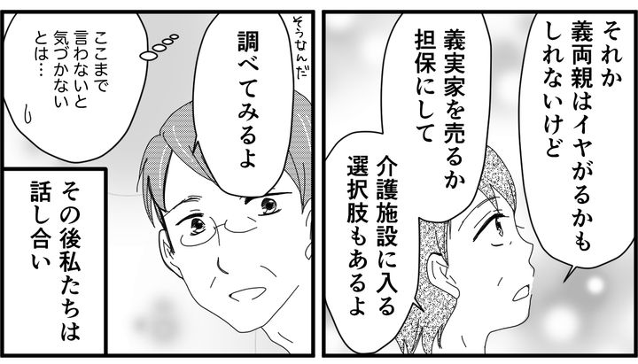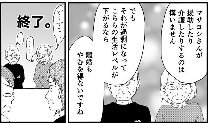「夫が援助や介護をするのは構わないが、そのせいでわが家の生活レベルが下がるなら離婚もやむを得ない」と言うと、義両親は何か言いたげながらも黙ってしまいました。