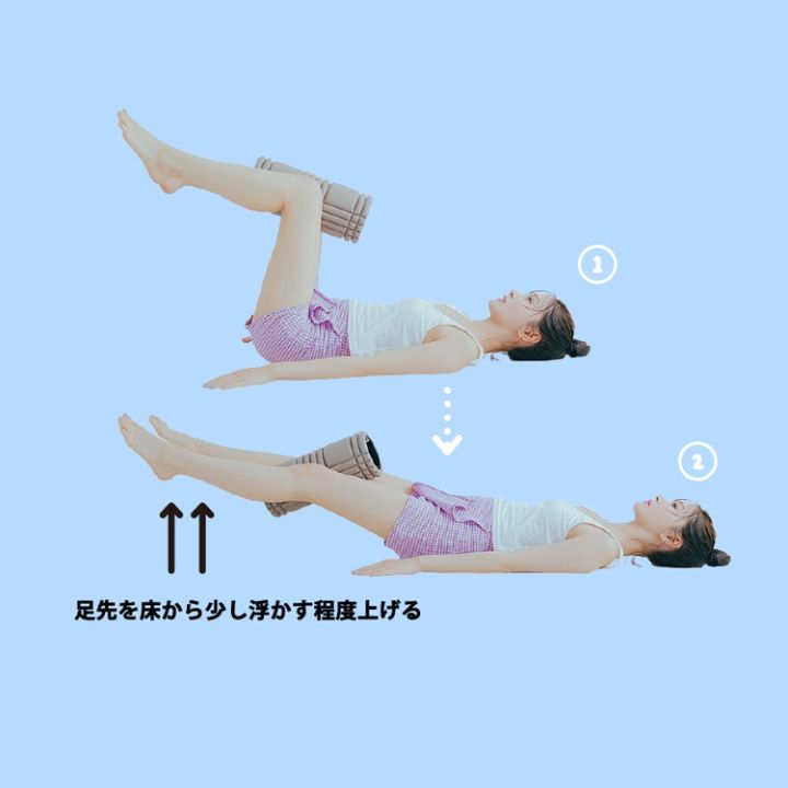 ②内ももに力を入れて脚をまっすぐのばす。数秒キープし、もとの体勢に戻る。