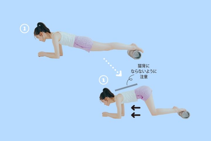 ①ローラーの上に両脚を置き、肩の真上にひじがくるようにプランクの姿勢に。