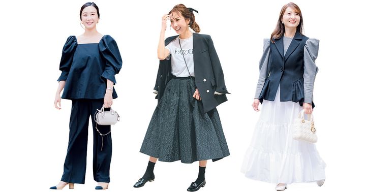 日頃子育てに追われているからこそ、着るだけで華やぐパフスリーブのトップスが目に留まりました。黒ワイドパンツを合わせて全体をモードに見せました。