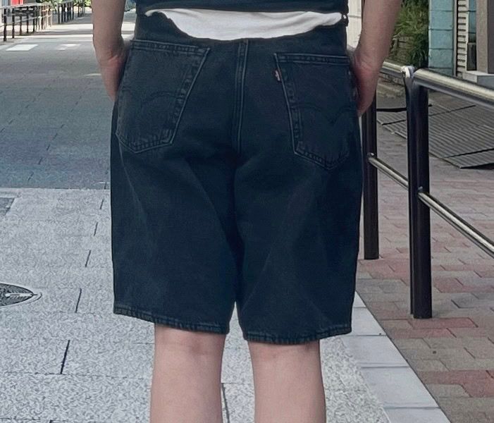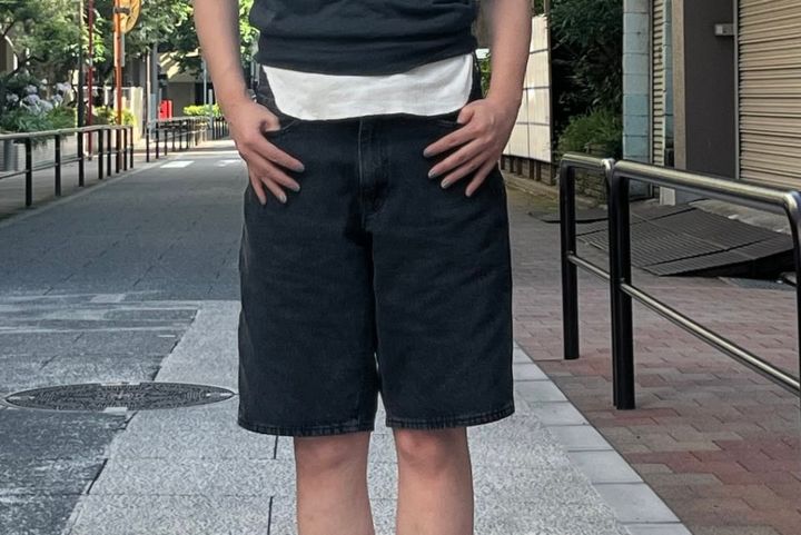 ハーフパンツは素材やシルエットによって印象が大きく変わるアイテム。そもそも筆者ははき慣れていないので、まずはなじみのある素材がよかったんです。さらに着まわし力も高いほうがイイ! そうなるとデニムの一択でした。で、いろいろ探していたのですが、なかなか好みの1本に出合えず。半ばあきらめていたときに【リーバイス】のショップに行く機会にあり、そちらで運命的な出合いを果たしました。それが「478 バギー ショートパンツ ブラック」です。