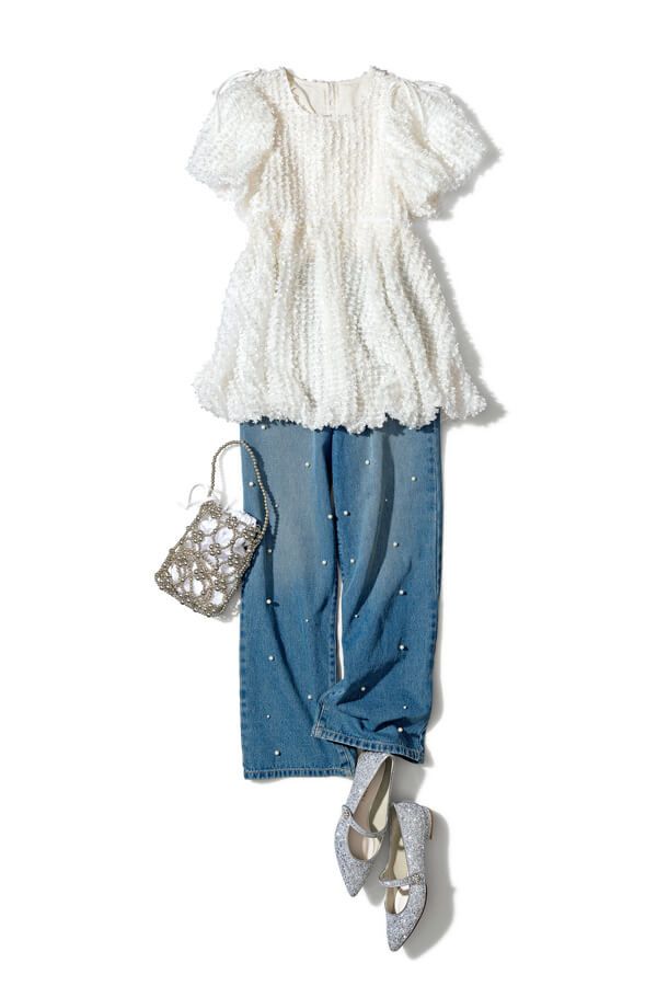 チュニックブラウス¥12,980/RANDA パール付きデニムパンツ¥2,590、ビーズバッグ¥1,499/ともにGRL グリッターメリージェーンフラットシューズ¥16,500/ダイアナ(ダイアナ 銀座本店)