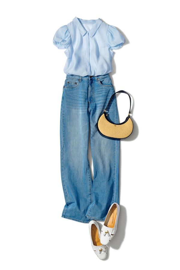 ブラウス¥17,600/CELFORD ワイドデニムパンツ¥3,990/神戸レタス バッグ¥17,900/CHARLES & KEITH ローファー¥19,800/銀座ワシントン(銀座ワシントン銀座本店)