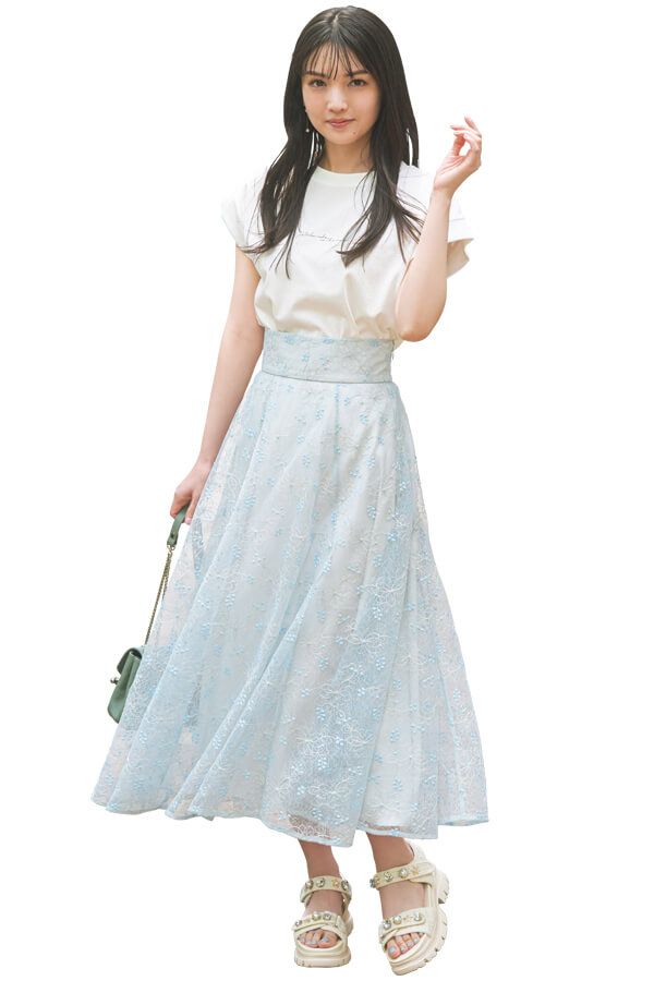 軽やかなオフホワイトのスポサンなら、エアリーなシアー素材のレーススカートとの相性も抜群。