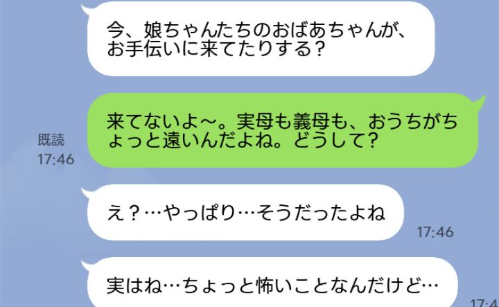 不思議に思いつつ、実母も義母も遠方なので来ていないことを伝えて、「どうして?」と聞きました。すると、幼稚園の近くで「〇〇の母です。娘とその子どもたちがお世話になっております」と高齢のご婦人からご挨拶されたと言うのです。