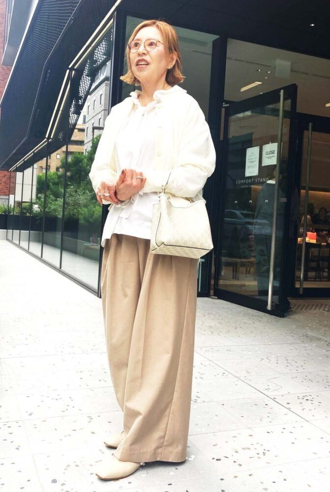 3. 【60代お手本スナップ】夏は白×ベージュで爽やかに!「ミラ オーウェン」のワイドパンツでトレンド感を取り入れた大人の上品ワントーンコーデ
