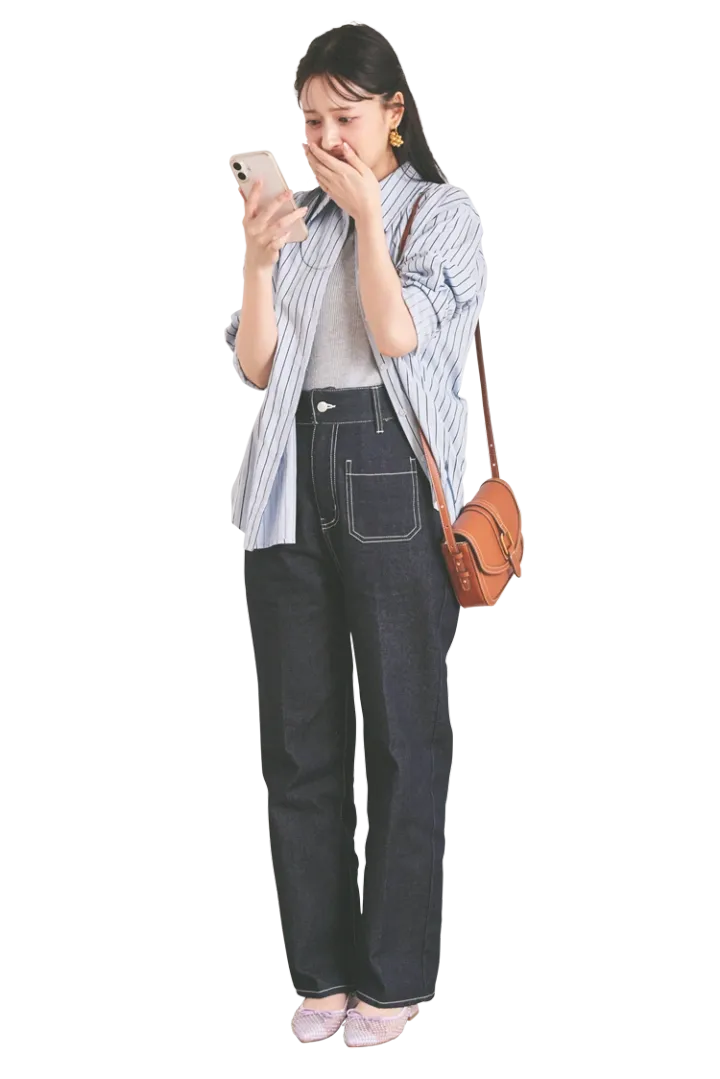 ステッチデニムパンツを用いたタックインスタイル。脚長効果&きれいめな印象を与えてくれる着こなしに。