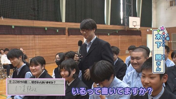 世永アナ:「好きな⼈いますか?」1年 木下さん:「俺ですか?いるって書いてますか?じゃあ、たぶん東くんです」