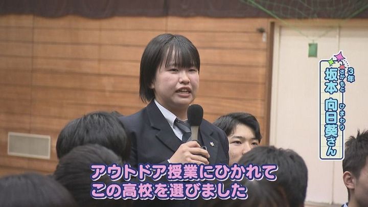 3年 坂本さん:「アウトドア授業にひかれてこの⾼校を選びました。カヌーとか、ラフティングとか軽登⼭をしたり、1年⽣は野外宿泊研修といって、キャンプをしたりとか」