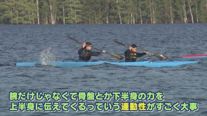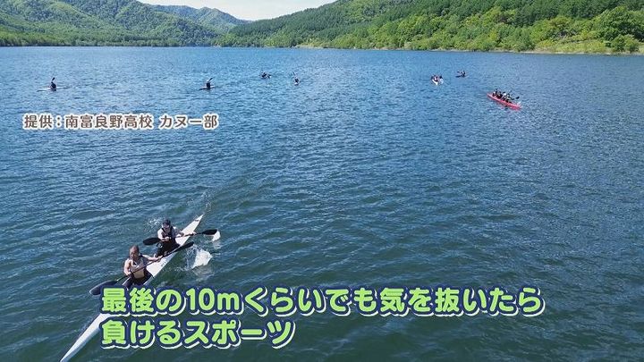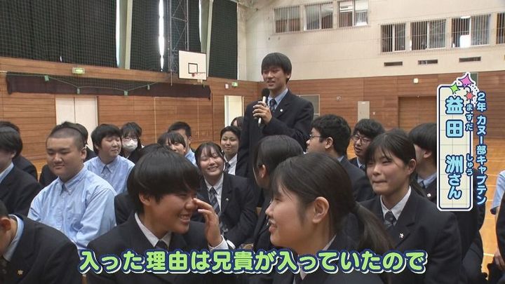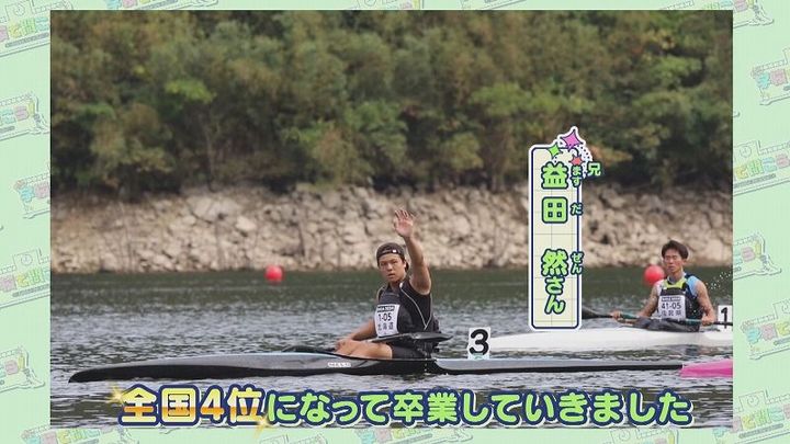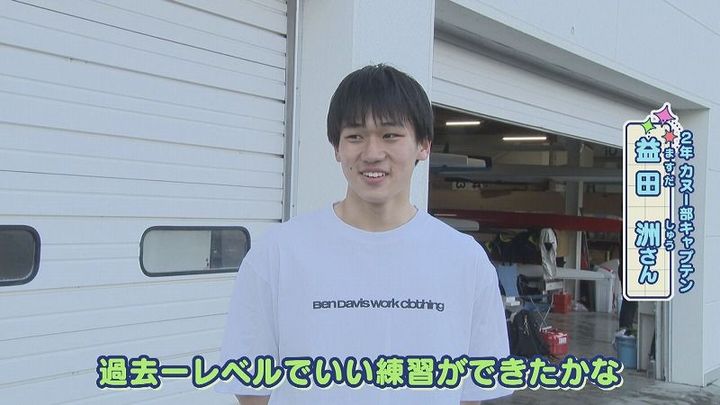 世永アナ:「⾃分もカヌー部に⼊ってみて感じる魅⼒は?」2年 益田さん:「最後の10mくらいでも気を抜いたら負けるスポーツ。10mまで諦めないことで⾃分に勝ったみたいなのを楽しめるスポーツなのかな。初めて⼤会⾏った時には緊張して⾃分の漕ぎができなくて、その中でも全⼒を出せる兄貴のメンタルがすごいな」